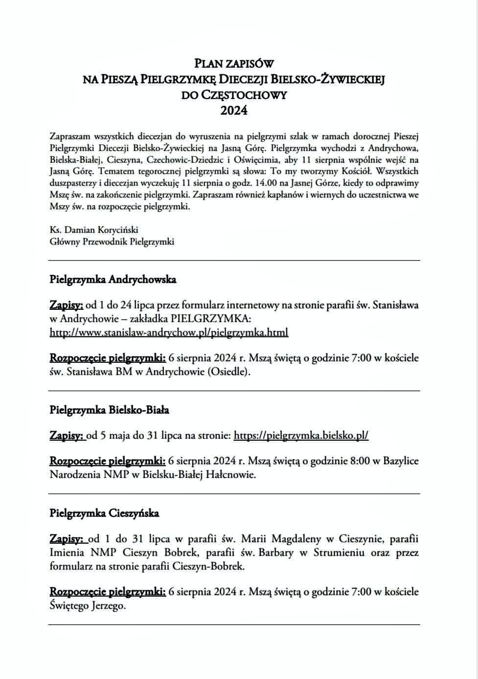 Główny przewodnik ks. Damian Koryciński przypomina, że można się już na pielgrzymkę zapisywać w swoich parafiach na terenie diecezji oraz w internecie.