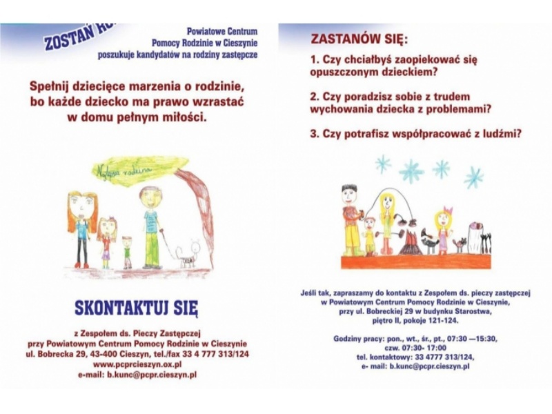 Jeśli interesuje Cię rodzicielstwo zastępcze, chcesz wiedzieć, kto i na jakich zasadach może zostać rodziną zastępczą, a może nią być zarówno osoba samotna, jak i małżeństwo – zapraszamy do kontaktu z PCPR w Cieszynie. Nabór na szkolenie dla kandydatów na rodziny zastępcze trwa cały rok. Potrzebne linki znajdziesz TUTAJ i TUTAJ.