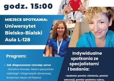 Tym razem miejsce spotkania to Uniwersytet Bielsko-Bialski, aula L-128. W programie zaplanowano prelekcje radiolożki i fizjoterapeutki, a także spotkania z innymi specjalistami i badania.