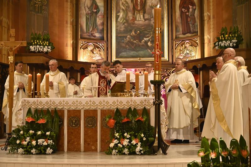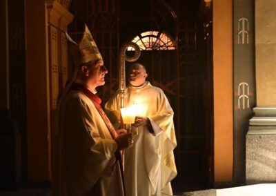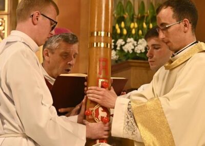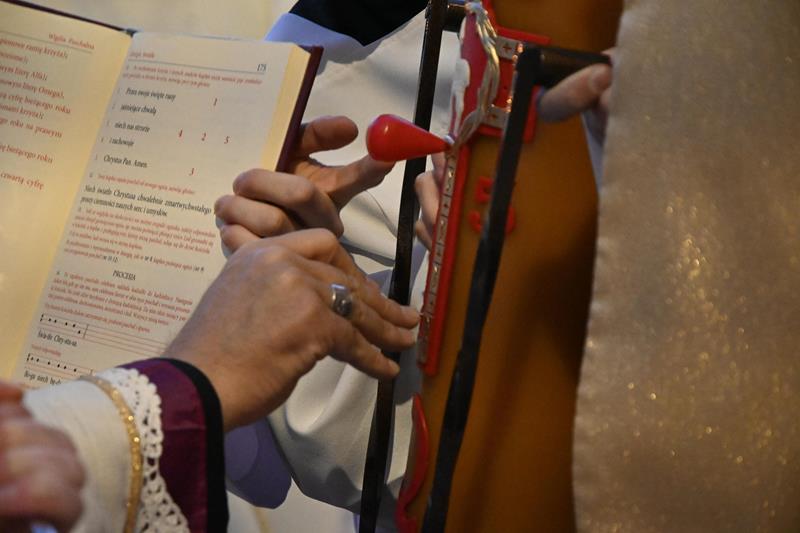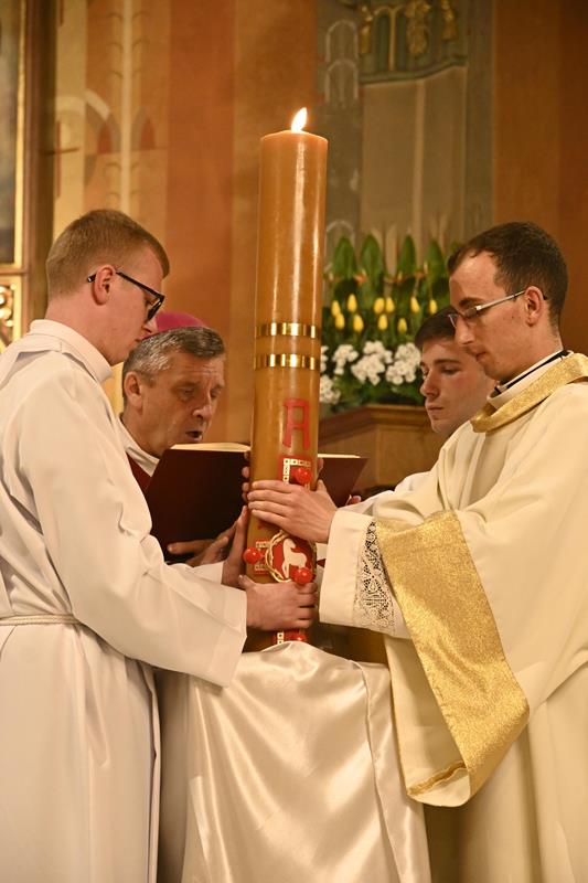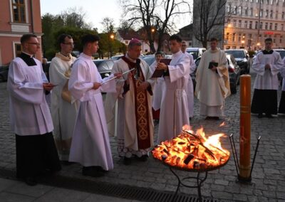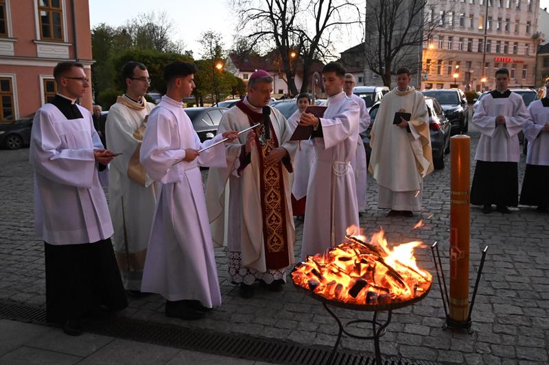„Dziś usłyszeliśmy wzorcowe głoszenie o zbawieniu, a jest nim po prostu, co przed chwilą usłyszeliśmy. Czytania biblijne ułożone w taki sposób stanowią konspekt czy gotowy bryk dla przedstawienia chrześcijańskiej nauki o zbawieniu. Należałoby zapytać, dlaczego właśnie dziś słyszymy taki zestaw czytań? Biorąc pod uwagę całość tej wyjątkowo długiej liturgii, możemy odpowiedzieć: Byśmy sobie uświadomili, że należymy do ludzi najbardziej szczęśliwych na świecie. Dlatego, że to Bóg każdego z nas wybrał, abyśmy byli zbawieni. Ze swej strony uczynił już wszystko, co roku dowiadujemy się, co teraz każdy ze swej strony musi zrobić, by Bóg mógł spełnić swoje największe pragnienie, byśmy mogli być z Nim na zawsze w miłości i pokoju. Zbawienie jest w stanie pojąć i pragnąć człowiek, który uznaje Boga jako Boga, a nie bożka, z którym można się targować, przekupywać, oszukiwać. Bóg zaś jest Panem świata i Panem dziejów. Człowiek istnieje, ponieważ Bóg chciał, by istniał i żył na zawsze, aby mógł z człowiekiem się dzielić, kochać go i obdarować szczęściem pełnym, najlepszym, niczym niezagrożonym i na zawsze. Bóg więc zarówno powołał do istnienia świat, a człowieka umieścił na szczycie całego stworzenia, ale także tylko Bóg może go wybawić od każdego zła i już tego dokonał. Wiara w to, że Jezus zmartwychwstał rodzi się w sercach uczniów Jezusa w oparciu o słowa zapowiadające cierpienia i śmierć Sprawiedliwego za grzechy, a także w oparciu o świadectwo tych, którym ukazał się żywy Jezus, a także o świadectwo tych, którzy widzieli grób pusty. Wiara w to, że Jezus powstał z martwych i żyje, było najważniejszą treścią przekazywaną przez uczniów Jezusa, którzy wcześniej byli słuchaczami Jego nauk, widzieli Jego cuda, wiedzieli o Jego męce i śmierci, ale też im On się ukazywał po zmartwychwstaniu, przekonywał o sensie wydarzeń wskazując na Pisma, które zapowiadały Jego śmierć i powstanie z martwych oraz dokonane przez Niego zbawienie. Odważne głoszenie o zbawieniu przez wiarę w Jezusa Zmartwychwstałego, oparte o zapowiedzi proroków i o naoczne świadectwo uczestników wydarzeń Wielkiego Tygodnia mogły przekonać pierwszych żydowskich słuchaczy, choć wciąż przeciwnicy Jezusa występowali przeciw temu, co głosili apostołowie. Do zbawienia i życia pojedynczego człowieka odnosi się najbardziej fragment czytanego dziś Listu do Rzymian. Zmartwychwstanie Chrystusa ma wpływ na życie tego, który uwierzył w Jezusa i przyjął chrzest. Przyjęcie chrztu stanowi pogrzebanie z Chrystusem, aby móc zmartwychwstać, jak On jako pierwszy powstał z martwych. Już teraz ochrzczony stał się wolny od grzechu i ma w sobie życie wieczne. Gdy upadnie, może powstać i pojednać się z Bogiem. Chrzest jednak stanowi stałe wyzwanie, by już nie popadać w grzech, ale żyć wciąż zjednoczony z Bogiem. Dlatego, po takim przedstawieniu, kim jesteśmy, jaki jest nasz status oraz jak bardzo jesteśmy wybrani i obdarowani przez Boga, czas na to, by podjąć decyzję odnośnie przyszłości. Dla niej zaś najważniejsze, co zrobimy z danym nam za darmo zbawieniem i życiem Bożym, a co wyraża się w tym, co chcemy zrobić z łaską chrztu. Dlatego to raz do roku postanawiamy we wspólnocie Kościoła, by trwać w łasce, wyrzekać się złego i jego wpływów, a zmierzać coraz bardziej zdecydowanie do życia świętego i zorientowanego na Boga. W ten sposób odpowiadamy na słowo Boże, którego obfitość do tego prowadzi”.