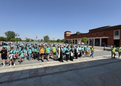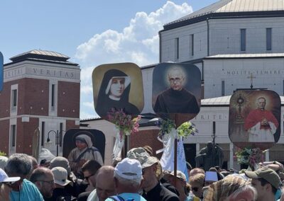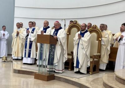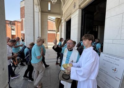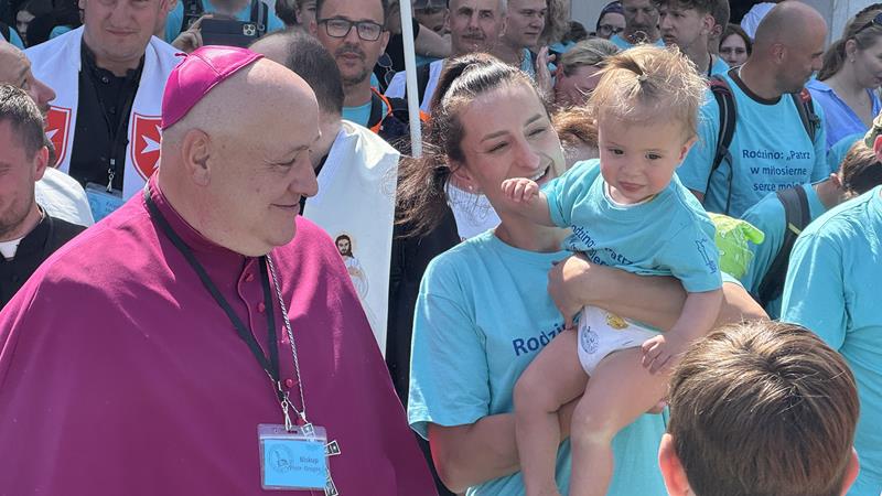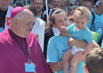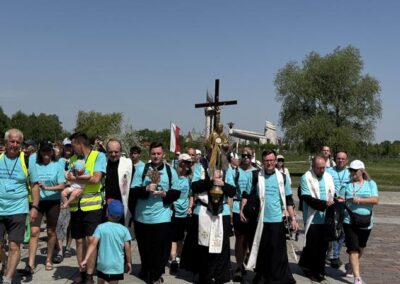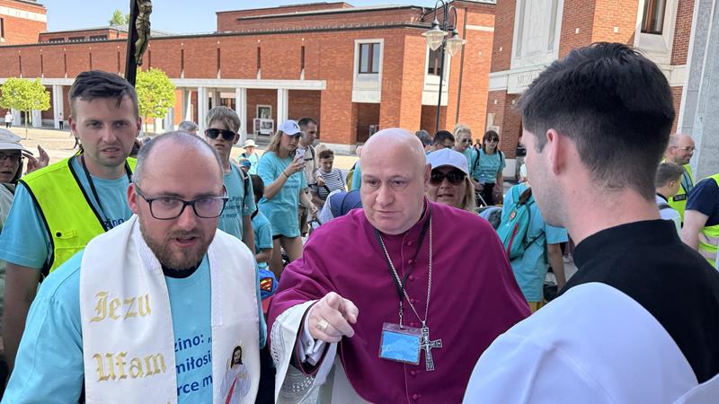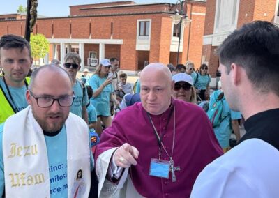 Na zakończenie Eucharystii ks. biskup Piotr podziękował pielgrzymom za podjęty trud i świadectwo na każdym odcinku drogi do krakowskich Łagiewnik. Poświęcony czas, akceptacja pewnych ograniczeń i przyjęcie zobowiązań, to są dowody, że dla Was sprawa priorytetu Boga jest czymś oczywistym. W tym przenikaniu się Kościoła i świata, z pełną świadomością życia na tej ziemi, jesteście osobami opowiadającymi się po stronie tego, co od Boga pochodzi. Maryjną szkołę bycia Kościołem potraktowaliście poważnie i z poczuciem odpowiedzialności. Przyjmijcie ode mnie szczere podziękowanie i uznanie. W tym momencie, na ręce księdza Marcina Samka, pragnę złożyć podziękowanie wszystkim kapłanom (diecezjalnym i zakonnym), osobom życia konsekrowanego, służbom dbającym o bezpieczeństwo na trasie pielgrzymki, ludziom dobrej woli, których spotkaliście po drodze, a takich nie brakowało. Była to już jak wspominałem trzynasta pielgrzymka naszej diecezji do krakowskich Łagiewnik, byłem na rozpoczęciu pielgrzymki w Hałcnowie 30 kwietnia br. i zaskoczyła mnie mile ilość pielgrzymów, a zwłaszcza młodych rodzin z małymi dziećmi i duża ilość młodzieży. Raduje się moje serce widząc tylu młodych ludzi. Oby tak dalej…