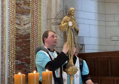 Mszy świętej sprawowanej po modlitwie w Godzinie Miłosierdzia przewodniczył ks. biskup Piotr Greger wraz kapłanami uczestnikami pielgrzymki na czele z ks. Marcinem Samkiem. Homilię wygłosił ks. biskup Piotr, który przypomniał, że uroczystość Najświętszej Marii Panny Królowej Polski, zarówno w wymiarze narodowym jak i religijnym, rodzi pytania o wzajemną relację, o przenikanie na naszych ziemiach tego, co polskie i tego, co kościelne.