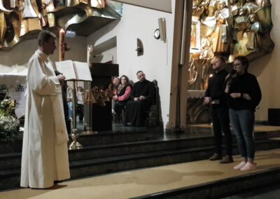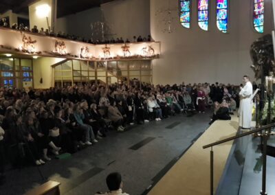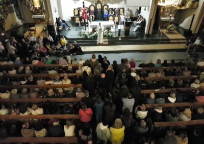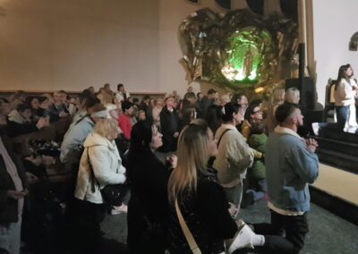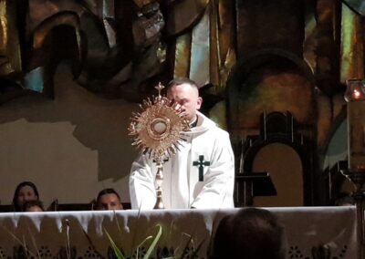 W kolejnej części wydarzenia wierni uczestniczyli w Adoracji Najświętszego Sakramentu z modlitwą uwielbienia i indywidualnym błogosławieństwem, które poprowadził ks. Paweł Krężołek SDS wraz z Wspólnotą Młoda 9 i zespołem Projekt Fausystem.