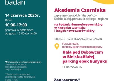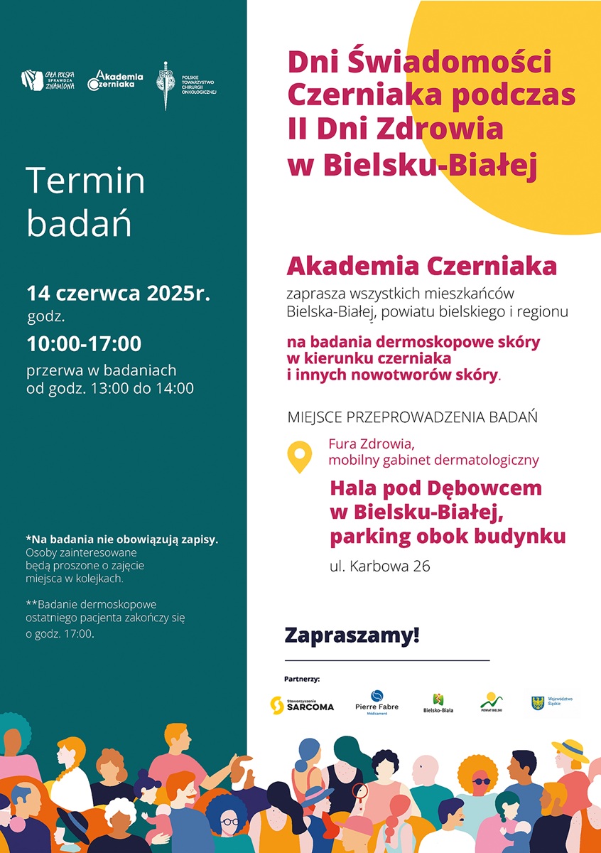 Po raz pierwszy na Dniach Zdrowia pojawi się Akademia Czerniaka, która zaoferuje mieszkańcom Bielska-Białej i powiatu bielskiego badania dermoskopowe skóry w kierunku czerniaka i innych nowotworów skóry. Badania będą się odbywać 14 czerwca w godz. 10-17.00 (z przerwą od 13.00 do 14.00) w dermobusie na parkingu obok hali pod Dębowcem.
