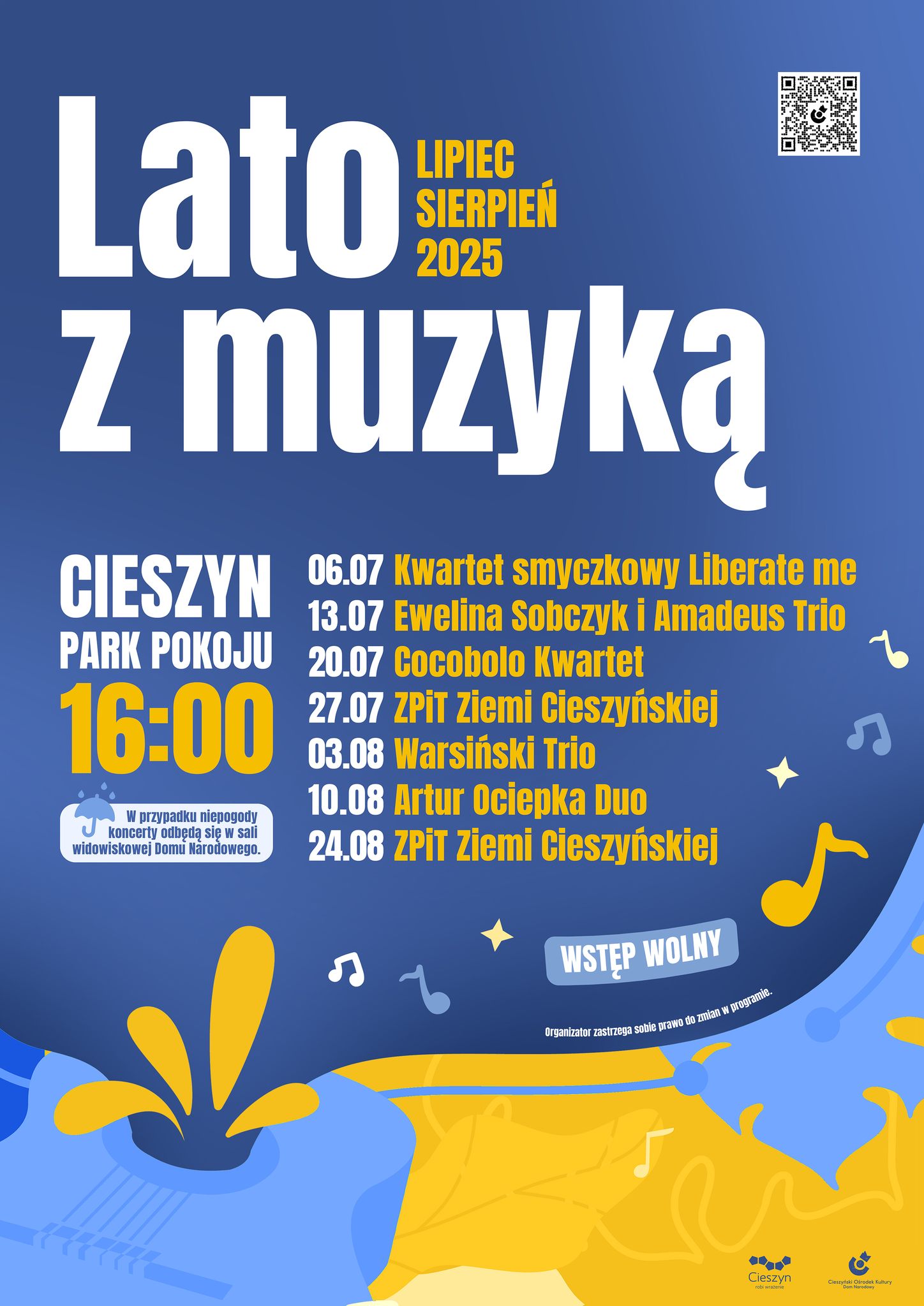 W lipcu i sierpniu powraca jeden z ulubionych letnich cykli wydarzeń!  Cieszyński Ośrodek Kultury „Dom Narodowy” serdecznie zaprasza do Parku Pokoju, gdzie w niedzielne popołudnia rozbrzmiewać będzie piękna muzyka – a wszystko to w ramach „Lata z muzyką 2025”!