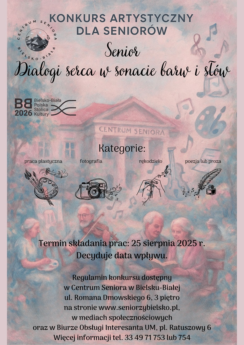 Właśnie ruszyła kolejna odsłona konkursu artystycznego dla seniorów, tym razem pod tytułem: Senior – Dialogi serca w sonacie barw i słów. Do udziału w konkursie zaprasza prezydent Bielska-Białej Jarosław Klimaszewski, czyniąc z tego konkursu jeden z punktów programu tegorocznych Dni Seniora.