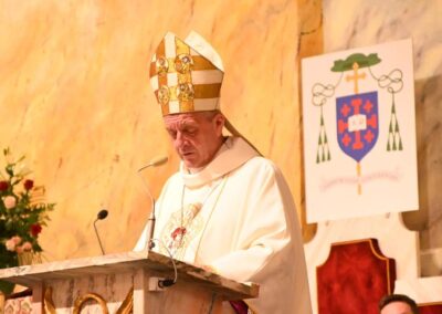 Marek Studenski- wikariusz generalny diecezji, Adam Bieniek – kanclerz kurii, Marcin Aleksy – proboszcz parafii, Piotr Góra- sekretarz ks. biskupa Romana, Piotr Hoffman – dyrektor wydziału duszpasterstwa ogólnego diecezji, Robert Samsel- dyrektor wydziału kadr, finansów, spraw gospodarczych i budowlanych diecezji i Piotr Grochowiecki – proboszcz parafii p w. św. Magdaleny w Mazańcowicach. Homilię wygłosił ks. biskup Roman, który zwracając się do wiernych powiedział m. in.: „Na czym polega osobiste oddanie się NSPJ, którego dokonamy dzisiaj? Na świadomym wypowiedzeniu słów wyrażających poddanie się Jezusowi całym sobą, z tym, co się posiada i będzie się czyniło. W tym akcie zwracamy się do Najświętszego Serca Pana Jezusa, aby podkreślić, że oddajemy się Jezusowi, który pierwszy z miłości do ludzi wydał się Ojcu, by ogołocony ze wszystkiego złożył swoje życie w ofierze za grzechy ludzi. Wpierw oddaje się swoją osobę i wszystkie czyny, a także różne przeciwności, które pojawią się w przyszłości. Odtąd celem całego życia i działania ma być uwielbienie, cześć i miłość Serca Jezusowego. Taki cel życia wyraża pragnienie, by teraz i na zawsze należeć do Jezusa. To pragnienie wyraża w odrzucaniu wszystkiego, co Jezusowi nie może się podobać i czynieniu wszystkiego, czego On pragnie.