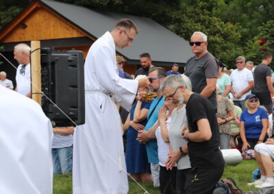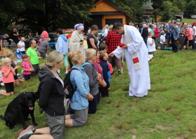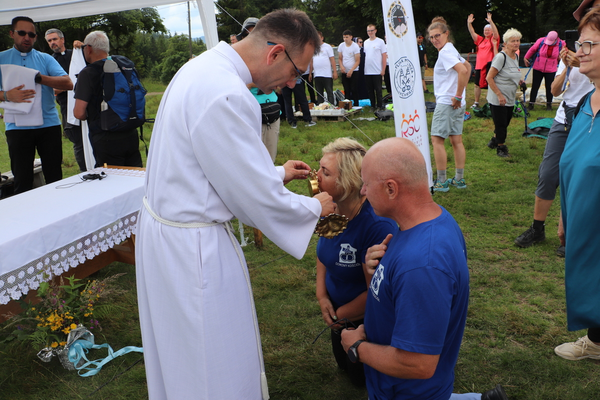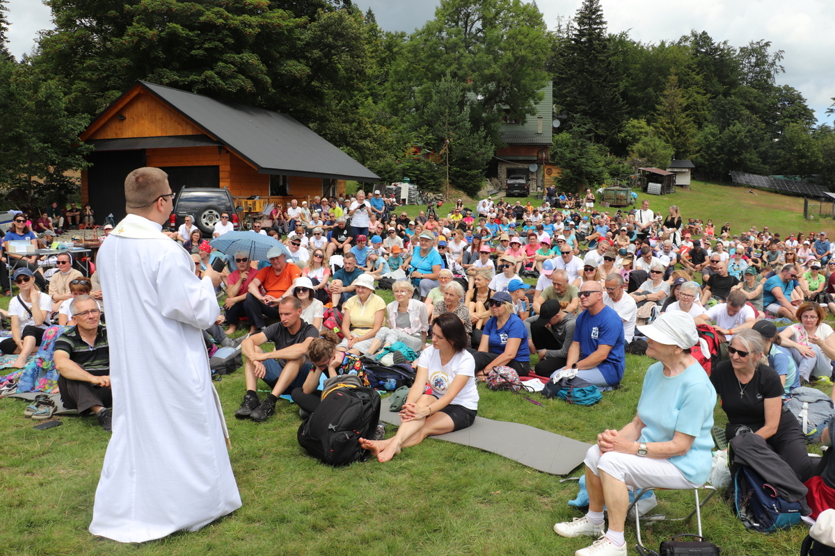 Witając zebranych ks. Grzegorz zapytał zgromadzanych: Czy są tutaj obecni pielgrzymi nadziei ? Na co chórem odpowiedziano – TAK. Więc chwała Panu, bo kto żyje nadzieją jest pielgrzymem nadziei. Wychodząc z domu zabierając rodzinę wchodząc na ten szczyt mamy nadzieję, że jesteśmy na drodze nadziei. I w Roku Jubileuszowym módlmy się jako pielgrzymi nadziei, aby nadzieja w nas wzrastała pamiętając, że jej źródłem jest sam Jezus Chrystus. Na ołtarzu złóżmy wszystkie swoje sprawy, problemy, z którymi przychodzicie i prośmy o dar miłosierdzia, żałując za wszystkie swoje grzechy. Towarzyszyć nam będą relikwie Rodziców św. Teresy od Dzieciątka Jezus – święci Zelia i Ludwik Martin, którymi po Mszy św. zostaną pobłogosławieni małżonkowie.