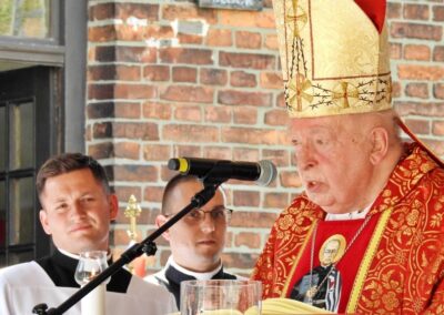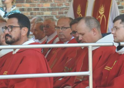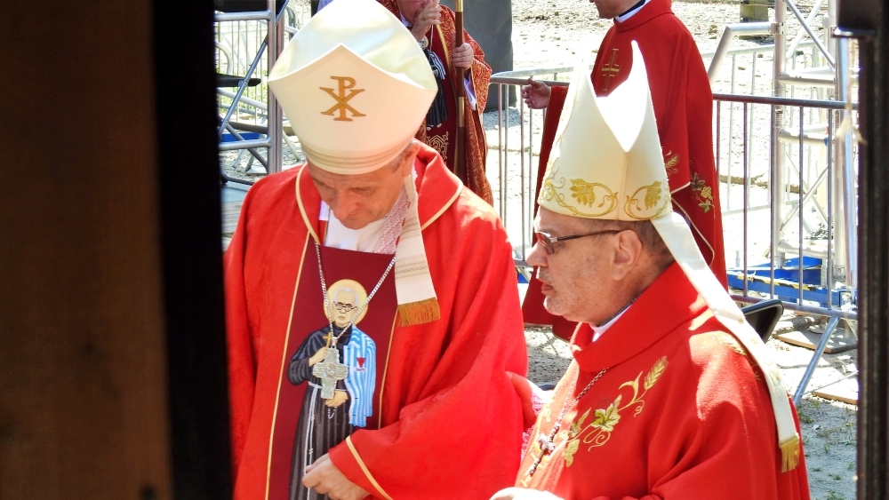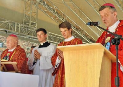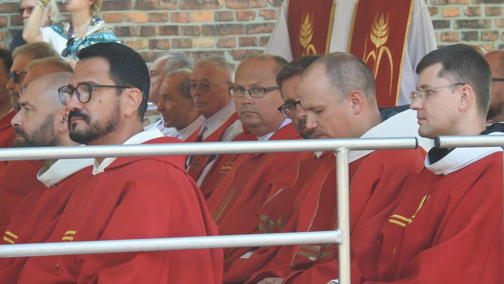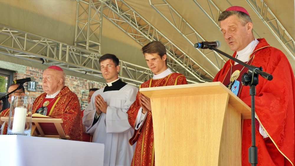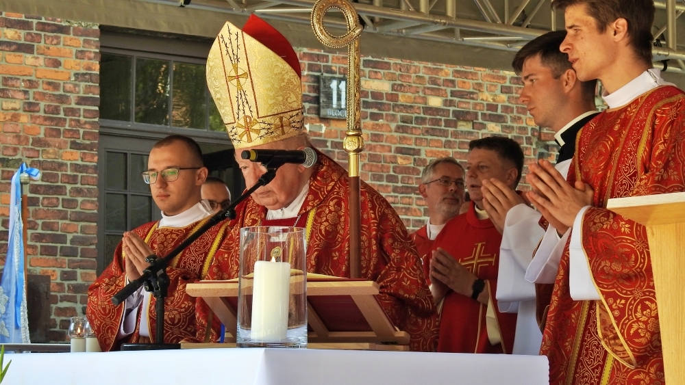 ks. biskup Kazimierz Górny- podkreślił potrzebę zachowania prawdy historycznej o pierwszych więźniach Auschwitz. „Niech ci, którzy nie rozumieją, przyjadą do Oświęcimia i zobaczą, czym był ten nowy świat bez Boga”. Zaapelował o obronę prawdy historycznej: „Musimy pamiętać, że pierwszymi, którzy tutaj przez dwa lata w okrutnych warunkach cierpieli, to byli więźniowie Polski. Mówię o tym, bo mnie to ogromnie boli, jak czytam te rozmaite informacje, że to jest obóz żydowski. Żydzi byli tu, ale byli Polacy, a potem do końca obozu do 1945 roku byli nie tylko Żydzi, nie tylko Polacy, ale i Rosjanie, i Romowie, i inne 21 narodowości”.Przestrzegał też przed uleganiem ideologiom i apelował o zachowanie wierności Bożym przykazaniom. „Jeśli zabraknie miłości, to będzie terror, przemoc, pogarda dla ludzi, deptanie człowieka i zamiana go w numer. Dlatego trzeba modlić się, by ludzie szanowali Boże przykazania i nie ulegali ideologiom, które przemijają.”