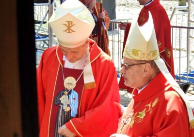 W Mszy świętej koncelebrowanej na placu przy Bloku nr 11, przewodniczył senior diecezji rzeszowskiej ks. biskup Kazimierz Górny OFM, a wraz nim przy ołtarzu modlili się ks. biskup Roman Pindel, ks. biskup Stanisław Dowlaszewicz z Boliwii, a także ojcowie franciszkanie – współbracia św. o. Maksymiliana, księża z diecezji bielsko- żywieckiej, archidiecezji krakowskiej i innych diecezji. W Mszy świętej uczestniczyli: misjonarki św. Maksymiliana, oświęcimskie siostry serafitki,a także wierni z oświęcimskich parafii, z diecezji bielsko- żywieckiej,z innych zakątków całej Polski oraz środowiska polonijne z całego świata.