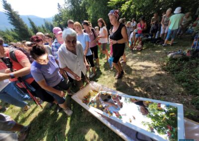 Kazanie wygłosił ks. Adam. Rozpoczął od przypomnienia przewodniego tematu „W nadziei życia wiecznego” i dalej wyjaśniał: – Mamy nadzieję na życie wieczne. Co musimy zrobić abyśmy mogli osiągnąć dar życia wiecznego? Dobrze się składa, że ten temat poruszamy w uroczystość Wniebowstąpienia NMP. Ona jest lepsza od nas, ale pod wieloma względami taka sama. Pokazuje nam jak dostać się do Nieba, jak mamy dojrzewać do życia wiecznego i do śmierci, co ukazują nam symbolicznie dojrzałe, bukiety ziół. Celem życia chrześcijanina jest przygotowanie się na spotkanie z Bogiem i osiągnięcie życia wiecznego. Mamy nadzieję na życie wieczne. Ostatecznym etapem, pełnią dojrzałości człowieka, będzie przejście przez śmierć. Śmierć jest przejściem do pełni dojrzałości człowieka i spotkania z Bogiem. Dla każdego ma On mieszkań wiele i aby zobaczyć siebie można na zakończenie popatrzeć w lustro znajdujące się, w położonej obok mnie trumnie, – specjalnym rekwizycie, aby zobaczyć swoje odbicie na tle niebieskiego, słonecznego nieba. Może nam to przypominać, że prawdziwym ludzkim przeznaczeniem jest dom Ojca, i życie w wieczności.