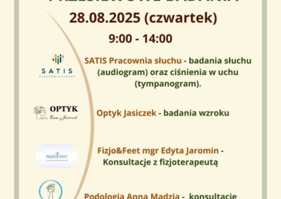 Tego dnia, od godziny 9.00 do 14.00, seniorzy będą mogli skorzystać z badania słuchu (audiogram) oraz ciśnienia w uchu (tympanogram), które przeprowadzi SATIS Pracownia Słuchu. W tych samych godzinach odbędzie się badanie wzroku przez specjalistów z Optyk Jasiczek i konsultacje z fizjoterapeutą Fizjo&Feet mgr Edytą Jaromin.