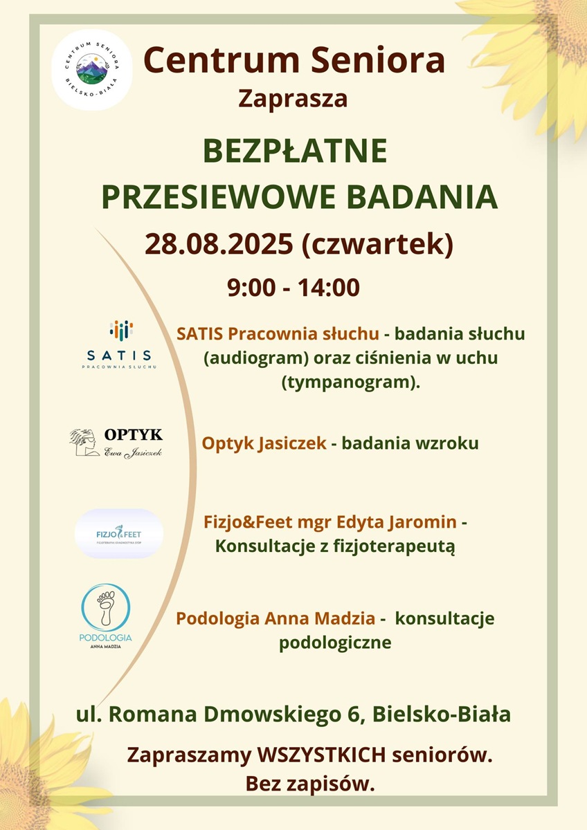Tę datę już teraz warto zapisać sobie w kalendarzu. 28 sierpnia br., Centrum Seniora w Bielsku-Białej przy ulicy Romana Dmowskiego 6 zaprasza seniorów z miasta na bezpłatne badania przesiewowe. Będą to badania słuchu, wzroku, konsultacje z fizjoterapeutą i podologiem (specjalista od schorzenia stóp i paznokci).