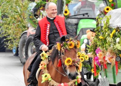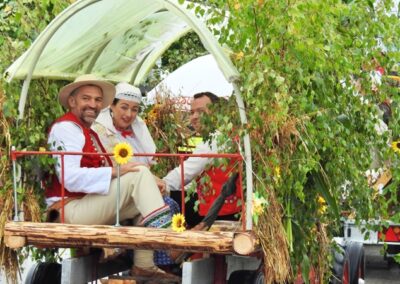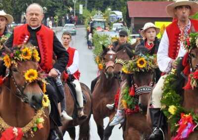 Po zakończonej liturgii mieszkańcy poszczególnych parafii w barwnych korowodach wyruszyli do Istebnej Centrum, gdzie pięknie przybrane banderie konne, dorożki, zaprzęgi, wozy i ciągniki z Istebnej, Jaworzynki i Koniakowa połączyły się we wspólny Korowód Dożynkowy i udali się do Kompleksu Istebna Zagroń, gdzie odbyła się artystyczna część świętowania.