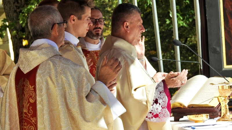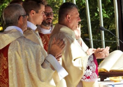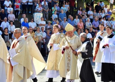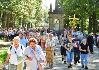 Pielgrzymka rodzin i małżeństw do kalwaryjskiego sanktuarium rozpoczęła się nabożeństwem Drogi Krzyżowej, odprawionym od stacji „u Piłata” aż na szczyt Golgoty. Rozważania przygotowane zostały w oparciu o tekst z Krajowego Ośrodka Duszpasterstwa Rodzin (KODR). Rozważania ukazywały małżeństwo i rodzinę jako współczesną drogę krzyżową, na której chrześcijanie stają wobec kulturowych i prawnych ataków na wspólnotę życia opartego na wiernej i płodnej miłości. Centralnym wydarzeniem była Msza św. przy ołtarzu polowym kalwaryjskiego sanktuarium, której przewodniczył ks. biskup Roman Pindel wraz z licznie zgromadzonymi duszpasterzami parafii z całej diecezji na czele z ks. Tomaszem Gorczyńskim – diecezjalnym duszpasterzem rodzin i Łukaszem Tlałką diecezjalnym moderatorem Domowego Kościoła Ruchu Światło i Życie. Słowo Boże do zebranych wygłosił ks. biskup Roman, który powiedział m. in: