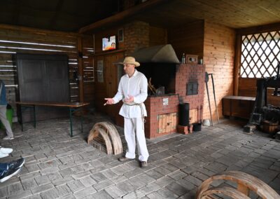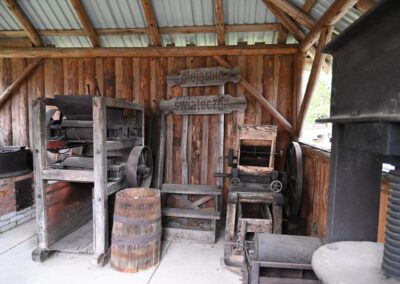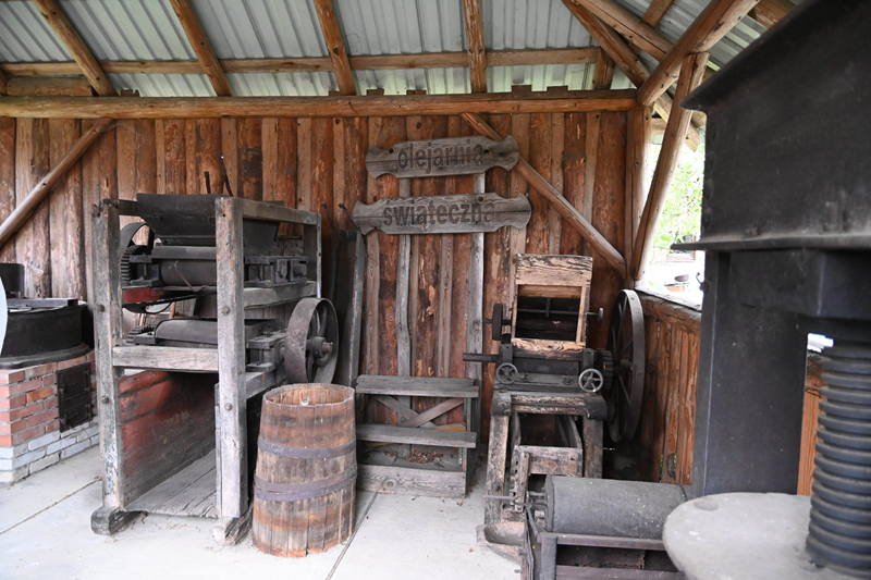 Obok czynnego małego zakładu produkcyj-no – usługowego, znajduje się skansen olejarski z pięcioma kompletami maszyn olejarskich, narzędziami do młócenia, czyszczenia, mielenia zbóż i do obróbki lnu i konopi. Duża wiata służy do pokazów bicia oleju na dwuwiekowych maszynach, projekcji programów tematycznych i degustacji potraw regionalnych. Wiata wyposażona jest w stoły i ławy dla starszych i stoliki dla mniejszych dzieci.