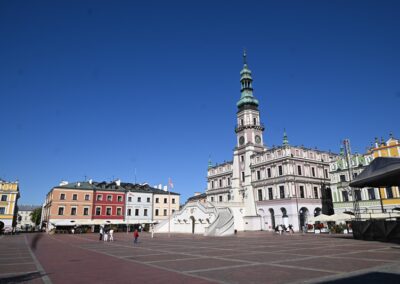Ostatnim dniu naszego pobytu udaliśmy się do Zamościa. Zamość jako prywatne miasto założył Jan Zamojski – kanclerz wielki koronny. Zlecił on pod koniec XVI wieku włoskiemu mistrzowi Bernardo Morando zaprojektowanie miasta idealnego – twierdzy, która miała na celu chronić włości Zamojskich. Tak właśnie powstał Zamość, nazywany Padwą Północy. Prawdziwe arcydzieło i perła renesansu. Przywilej lokacyjny Zamościa pochodzi z 1580r. Szczególne względy zyskali od Zamojskiego kupcy ormiańscy, którzy w XVII wieku wybudowali na głównym placu najznamienitsze kamienice, szokująco piękne po dziś dzień. Jan Zamojski, wkrótce po założeniu miasta, utworzył Ordynację zamojską, zatwierdzoną przez sejm Rzeczypospolitej. To wielki majątek ziemski, który nie mógł być dzielony i przechodził na najstarszego syna wcześniejszego ordynata. W chwili śmierci Jana, Ordynacja liczyła 23 miasta i ponad 800 wsi. Ordynacja istniała ponad 350 lat. Zlikwidowali ją dopiero ówczesne władze, które rządziły w naszym kraju po II wojnie światowej. Szczęśliwie cudna, idealnie zaprojektowana zabudowa miasta cieszy nasze oczy do dziś. Nic dziwnego, że w 1992 roku Stare Miasto Zamościa zostało wpisane na Listę Światowego Dziedzictwa Kultury Unesco. Złote czasy dla Zamościa przypadły na wiek XVII, który to był czasem największego i najszybszego rozwoju miasta. Na niewielkiej przestrzeni funkcjonował tutaj istny miks kulturowy. Żyła tutaj ludność Polska, jak również Grecy, Ormianie, czy też Żydzi. Niestety niepokoje, które szargały Rzeczpospolitą w tym czasie, zahamowały jego rozwój. Z stąd też powstała Twierdza Zamość w latach 1579–1618 na zlecenie Jana Zamoyskiego. Fortyfikacje również zaprojektował Bernardo Morando. Wybór miejsca powstania twierdzy nie był przypadkowy. Powstała ona na terenie dawnej wsi Skokówka, w rozwidleniu rzek Wieprzec (obecnie Topornica) oraz Kalinowicy (dziś Łabuńka). Dzięki spiętrzeniu wód obu rzek, utworzono zalew, który chronił miasto od południowego zachodu. Ponadto wody rzek pozwalały też na napełnienie fos otaczających mury od północnego wschodu. Po licznych przebudowach, twierdza ta stała się jedną z największych w Rzeczypospolitej Obojga Narodów, a następnie Księstwa Warszawskiego i Królestwa Polskiego. Największą atrakcją Zamościa jest Rynek Wielki, ma kształt kwadratu o wymiarach 100 m x 100 m. Są jeszcze dwa mniejsze rynki, Solny oraz Wodny.