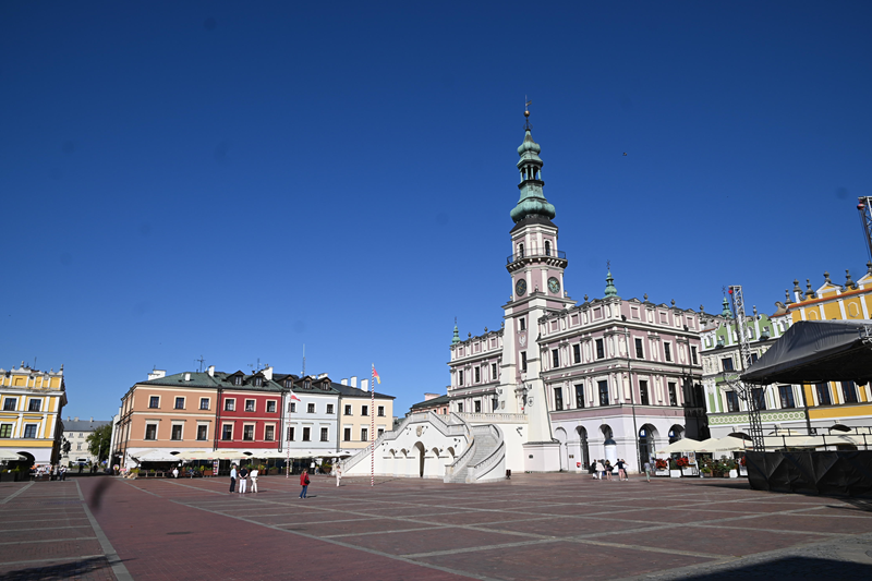 Co ciekawe, ratusz nie jest położony centralnie na rynku, jak to bywa na wielu miejskich rynkach, a znajduje się przy północnej pierzei, nieco z prawej strony. Jest też nieznacznie wysunięty do środka Rynku Wielkiego. Było to celowe działanie, ponieważ Jan Zamojski, założyciel miasta, chciał, aby najważniejszym obiektem w Zamościu był jego pałac, a nie ratusz. Budowę pierwszej formy ratusza rozpoczęto w roku 1591. Ratusz w Zamościu może pochwalić się 52 metrową wieżą zegarową oraz najbardziej charakterystycznymi, szerokimi, dwuskrzydłowymi wachlarzowymi schodami, które zostały dobudowane dopiero w XVIII wieku. Prowadzą one do głównego wejścia z barokowym portalem. Z wieży ratuszowej, codziennie w sezonie, gdy tylko wybije godzina 12:00, wybrzmiewa zamojski hejnał. Jednakże grany jest tylko na trzy strony świata. Trębacz pomija zachodnie okna, ponieważ zgodnie z legendą, założyciel miasta, Jan Zamoyski, zabronił, aby dźwięki niosły się w stronę Krakowa. To tutaj swoją siedzibę miał król Zygmunt III Waza, którego hetman nie darzył sympatią. Inna wersja głosi, że trębacz gra w kierunku trzech bram miejskich. Dziś w zamojskim ratuszu znajduje Urząd Miasta, Straż Miejska oraz co ważne, Biuro Informacji Turystycznej. W podziemiach ratusza znajduje się trasa turystyczna, która przedstawia historię budynku. O pięknym Zamościu można pisać bez końca, w wielkim skrócie przedstawiłem Wam drodzy czytelnicy historię tego przepięknego miasta.