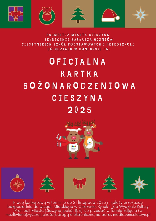 Burmistrz Miasta Cieszyna zaprasza serdecznie dzieci z przedszkoli oraz uczniów szkół podstawowych z terenu miasta do udziału w konkursie pod hasłem „Oficjalna kartka bożonarodzeniowa Cieszyna 2025”. Uczestnicy mają za zadanie przygotować pracę plastyczną w formie kartki świątecznej, która odzwierciedli ich indywidualne spojrzenie na święta – ich atmosferę, tradycje i magię Bożego Narodzenia.