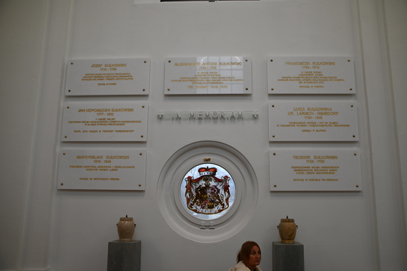 W 2021 roku w krypcie kaplicy złożono urnę z ziemią z cmentarza w Terezinie. Luiza Sułkowska de domo baronówna Larisch-Nimsdorf (Osiek 1790–Słupna 1848). Właścicielka kopalń i hut na Śląsku, w Królestwie Polskim i Rzeczypospolitej Krakowskiej. Zginęła w Słupnej. Maksymilian Sułkowski (Bielsko 1816–Wiedeń 1848). Podróżnik, odkrywca, demokrata i rewolucjonista – uczestnik Wiosny Ludów. Poległ na barykadach Wiednia, został pochowany na cmentarzu wiedeńskiej dzielnicy Heiligenstadt. W 2021 roku w krypcie kaplicy złożono urnę z ziemią z nieistniejącej nekropolii. Teodor hrabia Sułkowski –Łęczyca 1728–Bielsko 1792) Podpułkownik wojsk habsburskich, administrator bielskiego zamku, ojciec Józefa Sułkowskiego. Pochowany w kościele św. Mikołaja.