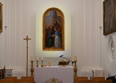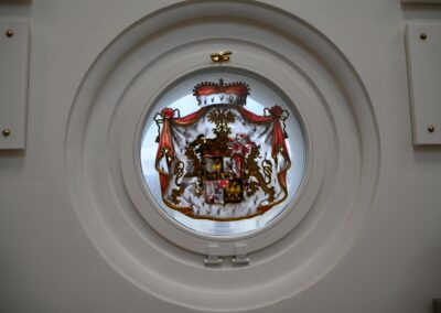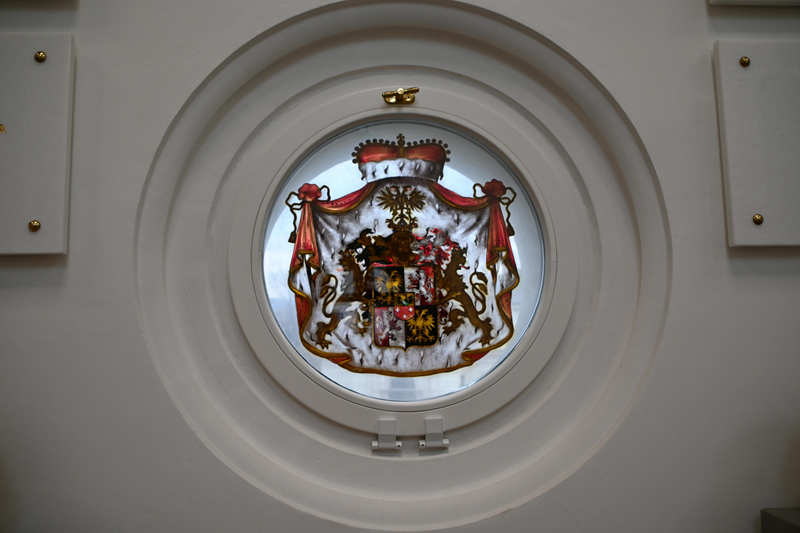 Na posadzce kaplicy położono płyty piaskowcowe nawiązujące do pierwotnych z zachowanym w części ołtarzowej świadkiem. Miejsca istniejących pochówków zaznaczono za pomocą napisów epitafijnych wykonanych metodą metalowej inkrustacji w kamieniu. Na wprost wejścia, ponad oculusem z herbem, zawieszono tablice epitafijne, upamiętniające znaczniejszych członków familii książęcej, których groby nie przetrwały do współczesności. Na co dzień kaplicę można oglądać z empory od strony ekspozycji stałej w zamku.