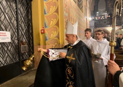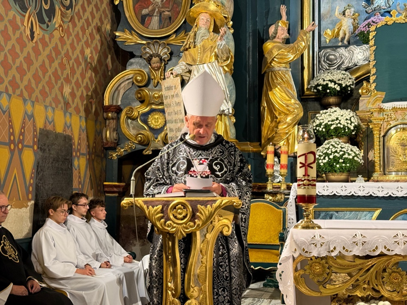 „W wspomnienie Wszystkich wiernych zmarłych przyszliśmy do żywieckiej konkatedry, aby zanosić nasze modlitwy za zmarłych, których przez kilka wieków chowano wokół świątyni i pod jej posadzką, a niemal od stu lat w kaplicy z Kryptą dla zmarłych z Rodziny Habsburgów. Chcemy też modlić się za naszych bliskich zmarłych oraz kapłanów i siostry zakonne, którzy tu pracowali bądź stąd pochodzili. Nie trzeba dzisiaj uzasadniać modlitwy za bliskich zmarłych, którym ją jesteśmy po prostu winni, ale dobrze uświadomić sobie słuszność modlitwy za innych. Dzisiejsza procesja do kilku stacji, przy których modlimy się za kolejne grupy zmarłych, wymieniając ich i z imienia. W królewskiej Katedrze na Wawelu są zanoszone modlitwy za władców, biskupów, uczestników powstań, twórców niepodległości Polski, dowódców i żołnierzy walczących w obronie Ojczyzny, o wyzwolenie innych narodów i tych, którzy dziś stoją na straży pokoju i bezpieczeństwa w świecie.