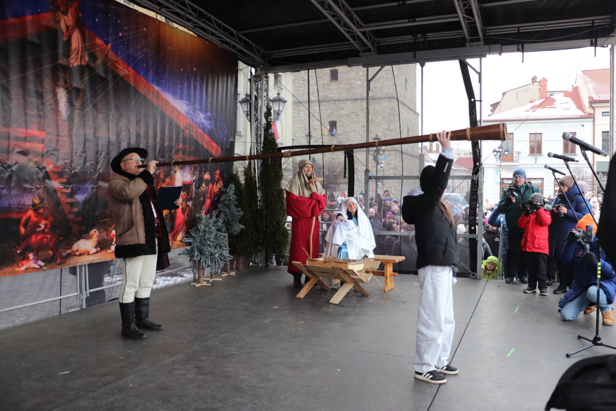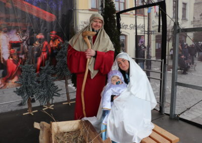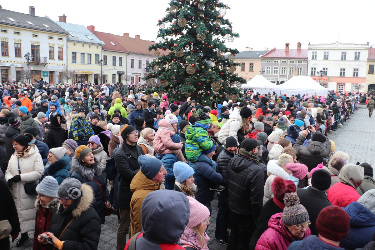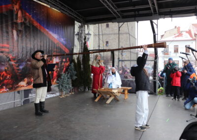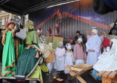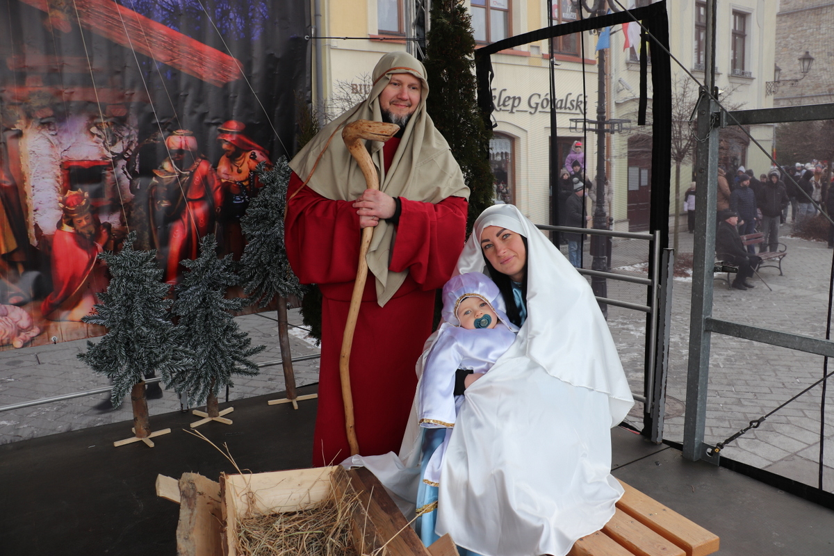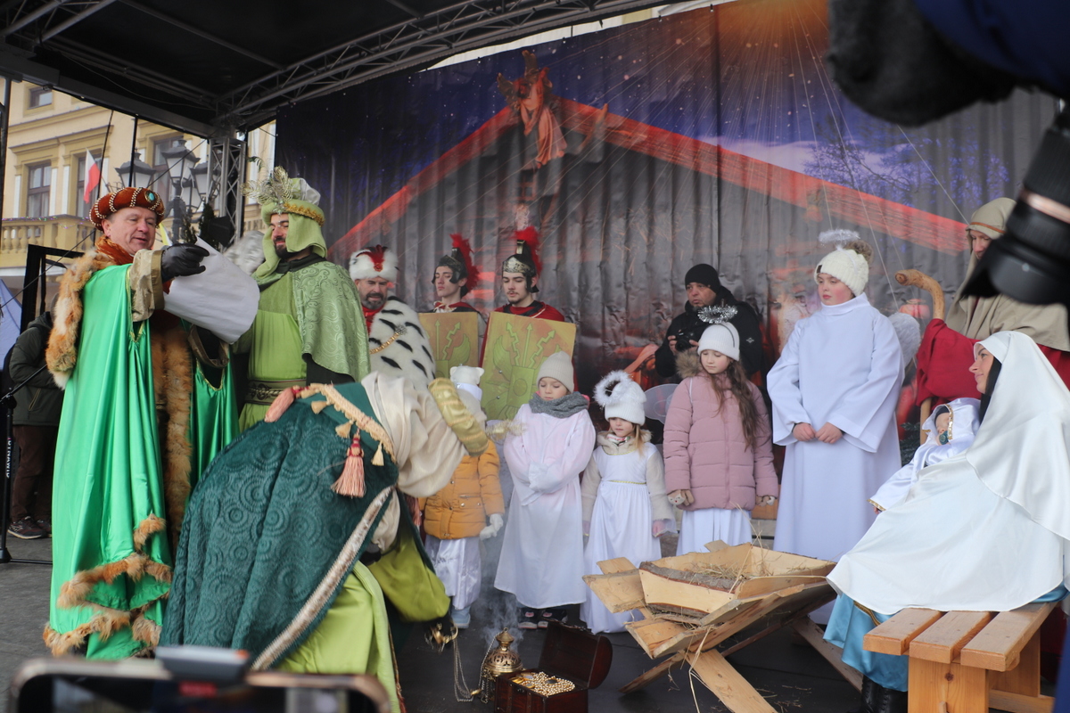 Pokłon Dzieciątku złożyli też przedstawiciele uczestniczących w orszaku zespołów regionalnych, którzy m.in. złożyli uroczyste ślubowanie wierności wierze przodków, uświetnione honorowymi salwami. Cały czas rozbrzmiewały kolędy. Uroczystość na Rynku poprowadził Andrzej Maciejewski, a w roli Świętej Rodziny wystąpili Karolina i Maciej Jamborek wraz z synem Piotrusiem.