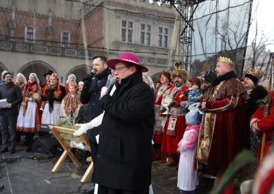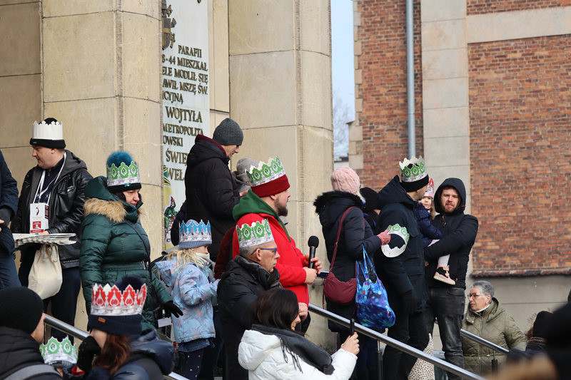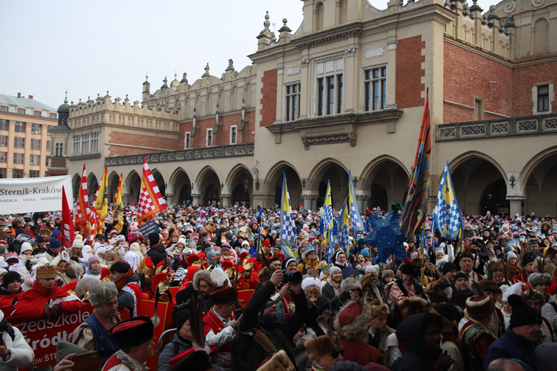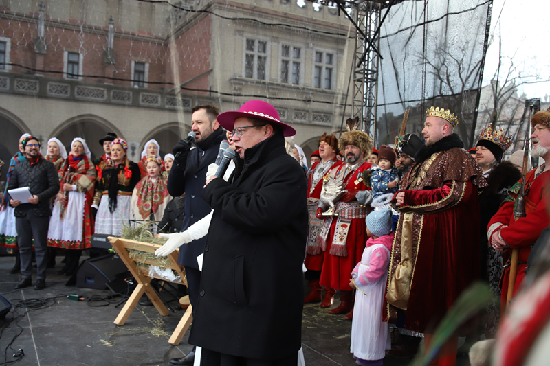 W południe na Rynku Głównym czerwony orszak spotkał się z zielonym-azjatyckim, który drogę rozpoczął pod kościołem św. Stanisława Kostki na Dębnikach oraz niebieskim-afrykańskim, który wyruszył z Placu Jana Matejki. Ks. kardynał Grzegorz Ryś poprowadził modlitwę Anioł Pański w intencji miasta Krakowa i papieża Leona XIV. Prezydent Aleksander Miszalski podkreślił piękno tradycji Orszaków Trzech Króli i złożył mieszkańcom Krakowa noworoczne życzenia. Metropolita Krakowski powiedział, że wprawdzie na króla się nie nadaje, ale cieszy się, że jest pasterzem. Nawiązując do pokłonu mędrców w Betlejem, ks. kardynał zauważył, że królowie przeszli tysiące kilometrów, tymczasem Herod i uczeni w Piśmie z Jerozolimy mieli jakieś 20 kilometrów, ale nie ruszyli się z domu, żeby zobaczyć Króla Żydów. – Życzę Wam, żeby znajomość Pana Jezusa zawsze zmuszała Was do jakiejś drogi, żebyście nie stali w miejscu, wszystko wiedząc, ale nigdy się nie ruszając. (…) Bądźcie jak trzej królowie, nie bądźcie jak Herod. Chodźcie do Jezusa – mówił ks. kardynał Grzegorz Ryś. Glinianego ptaszka w darze Dzieciątku Jezus złożyli Krakowscy kupcy. Bursztyny – złoto północy ofiarował król Bolesław Chrobry, a Zygmunt Stary – lutnię, z której struna została dodana do stopu, z którego wykonany został dzwon „Zygmunt”. Następnie hołd złożyli królowie Kacper, Melchior i Baltazar oraz dary złoto, kadzidło i mirrę. Na wezwanie „Witaj Królu w żłobie” wszyscy zgromadzeni na krakowskim rynku odpowiedzieli „Kłaniamy się Tobie”. Wydarzenie zakończyło się wspólnym kolędowaniem z Magdaleną Steczkowską oraz ks. kardynałem Grzegorzem Rysiem i prezydentem Aleksandrem Miszalskim.