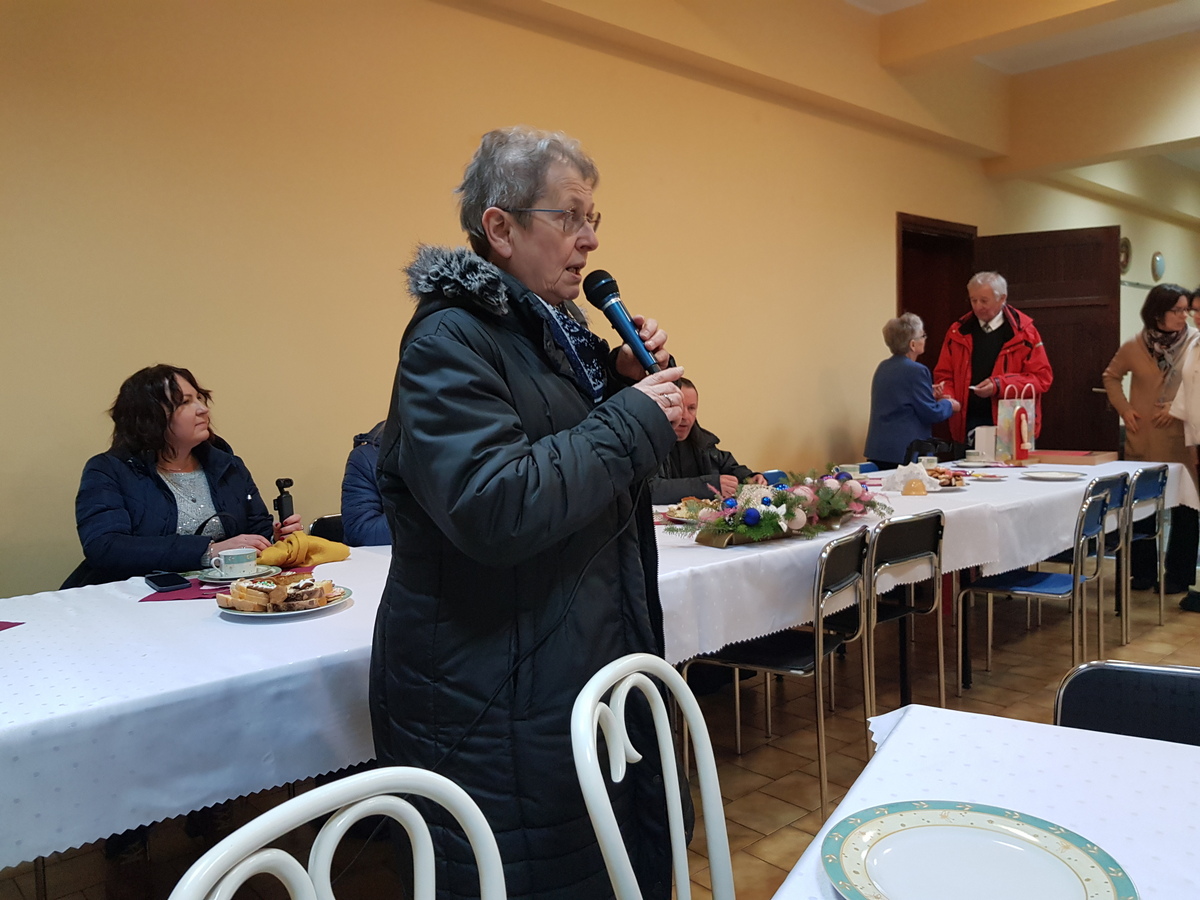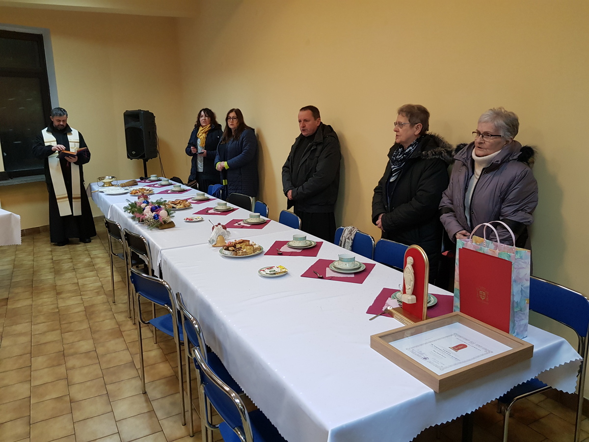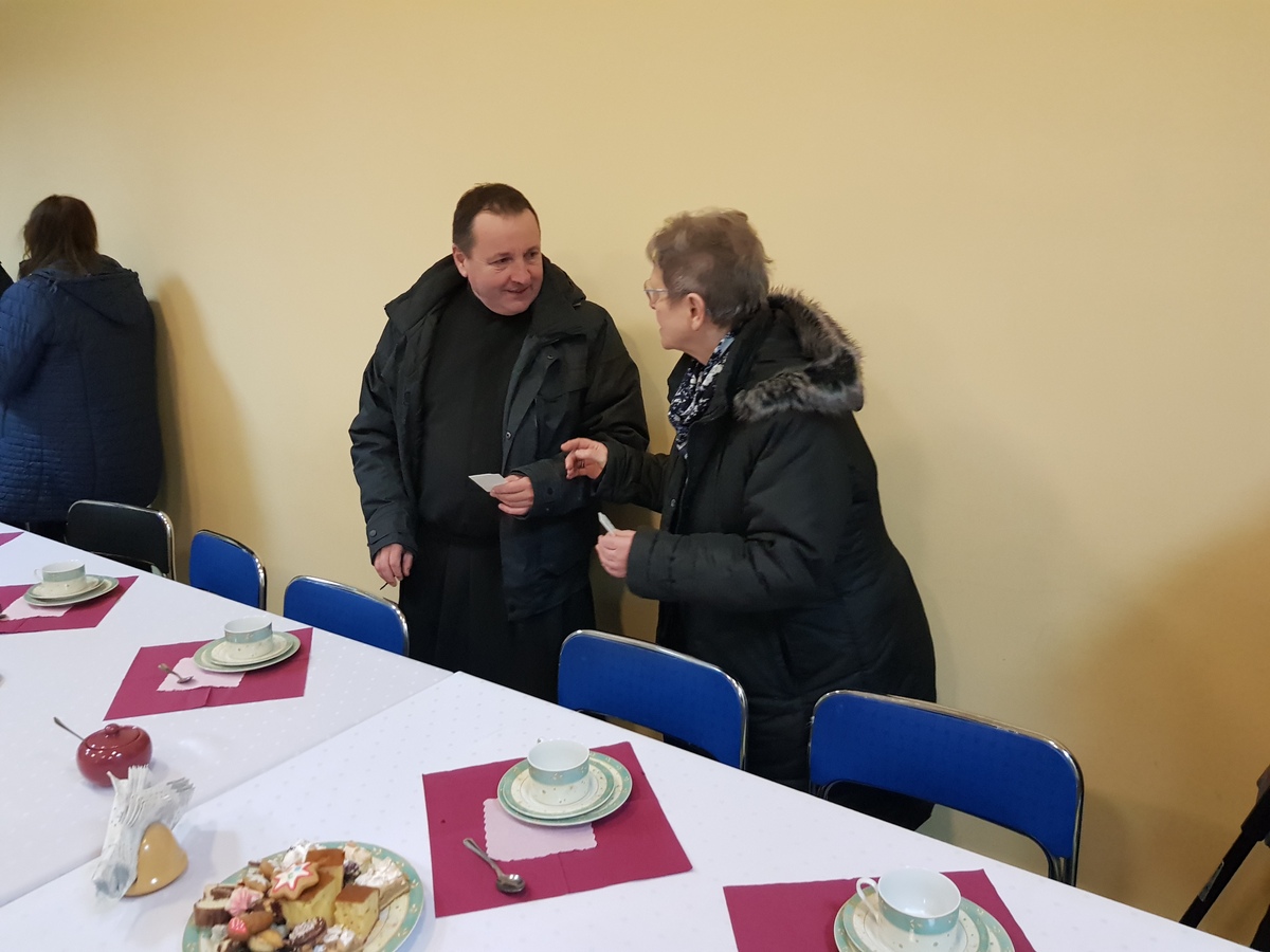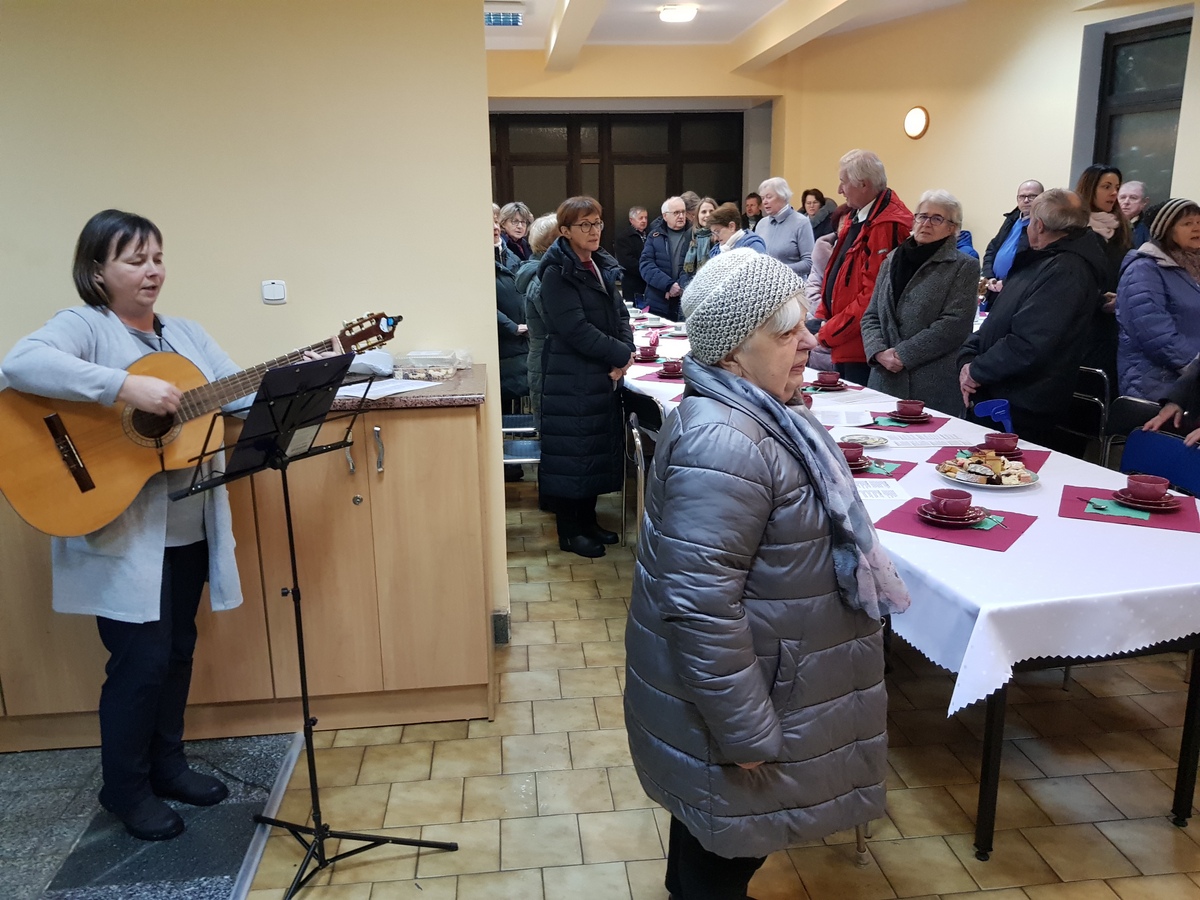 Po wręczeniu Pani Józefie Staroń nagrody i zakończeniu Mszy Św. odbyło się spotkanie opłatkowe w salce pod kościołem. Po błogosławieństwie opłatków nastąpiło składanie serdecznych życzeń miedzy wolontariuszami, przybyłymi rodzinami chorych. Były to wzruszające chwile, podczas których dziękowano za opiekę wolontariuszom, ich ciepłe, życzliwe podejście do chorych, wielką okazaną troskę o najbliższych. Ta wdzięczność wywołała wśród zebranych wyjątkową, rodzinną atmosferę spotkania i serdeczne podziękowania wolontariuszom za ich bezinteresowną pomoc niosącą radość i odprężenie. Spotkanie było uświetnione śpiewem kolęd przy pięknie zastawionych stołach i oprawie muzycznej gitarzystki Joanny Stokłosy.