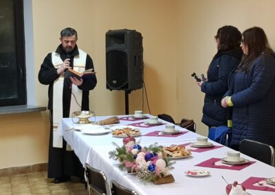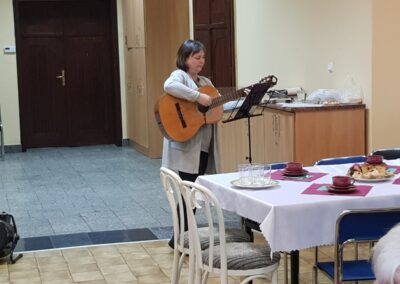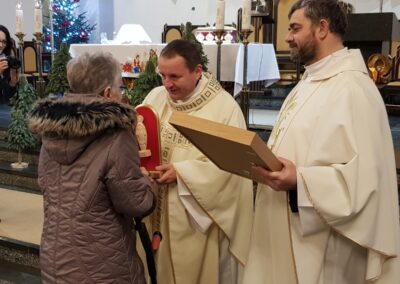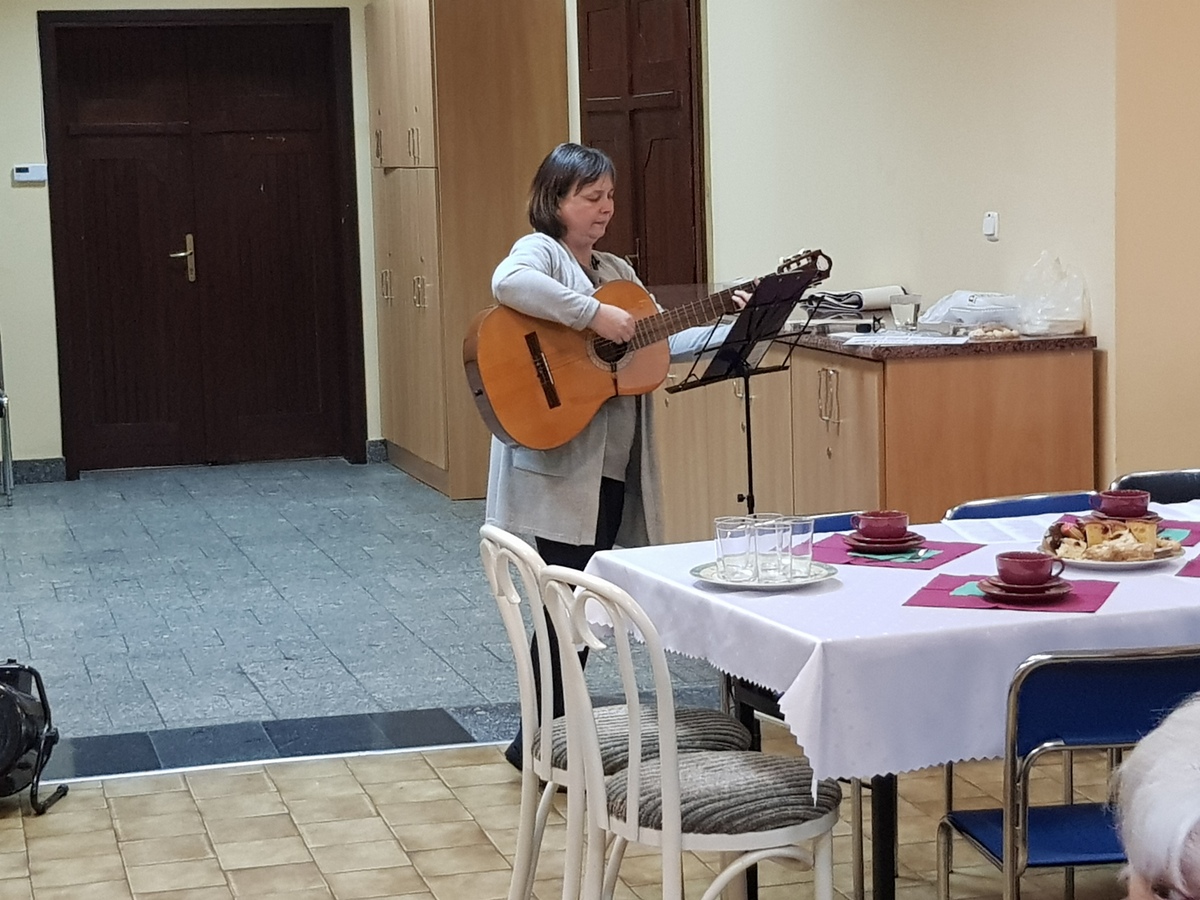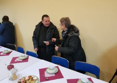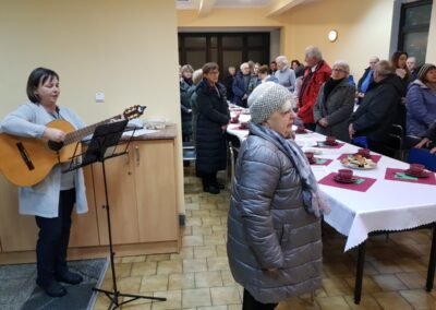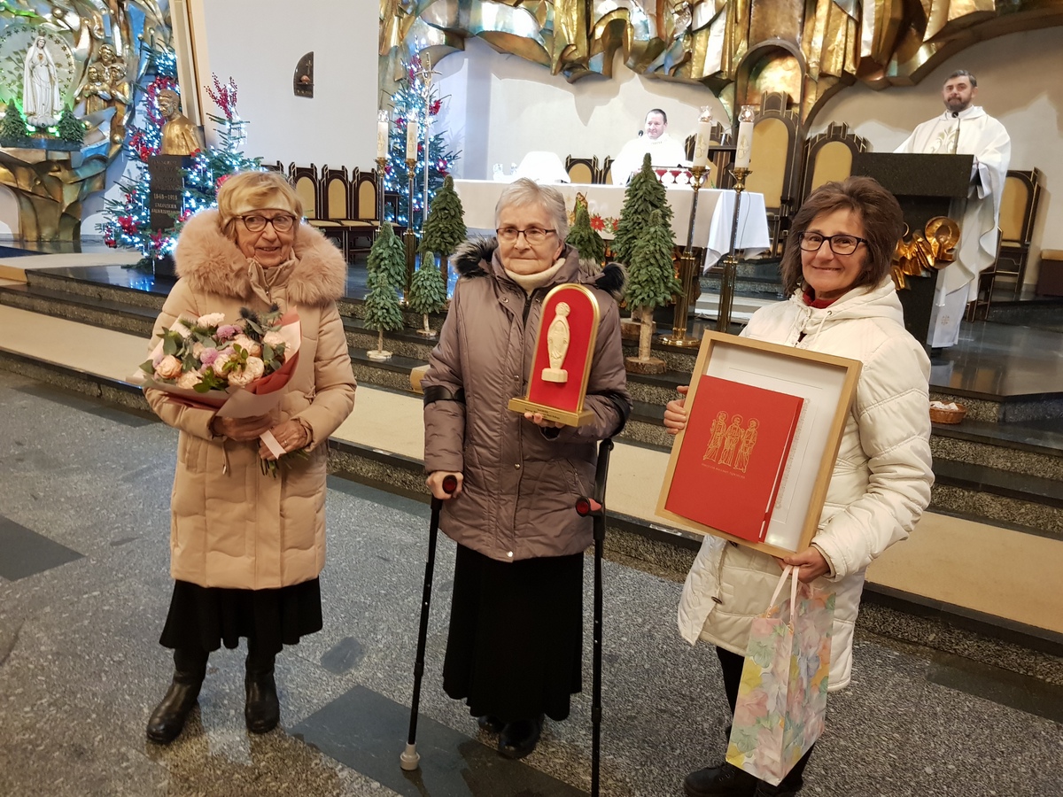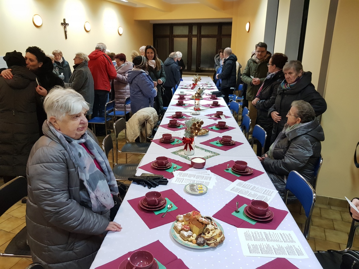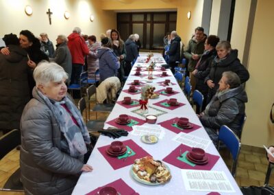 Po wręczeniu Pani Józefie Staroń nagrody i zakończeniu Mszy Św. odbyło się spotkanie opłatkowe w salce pod kościołem. Po błogosławieństwie opłatków nastąpiło składanie serdecznych życzeń miedzy wolontariuszami, przybyłymi rodzinami chorych. Były to wzruszające chwile, podczas których dziękowano za opiekę wolontariuszom, ich ciepłe, życzliwe podejście do chorych, wielką okazaną troskę o najbliższych. Ta wdzięczność wywołała wśród zebranych wyjątkową, rodzinną atmosferę spotkania i serdeczne podziękowania wolontariuszom za ich bezinteresowną pomoc niosącą radość i odprężenie. Spotkanie było uświetnione śpiewem kolęd przy pięknie zastawionych stołach i oprawie muzycznej gitarzystki Joanny Stokłosy.