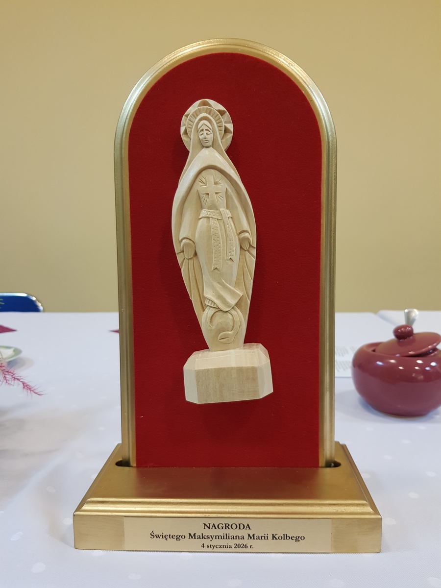 Na zakończenie modlitwy odbyło się, wcześniej zapowiedziane, uroczyste wręczenie nagrody hospicyjnej św. Maksymiliana Kolbe wolontariuszce Józefie Staroń. Nagroda ta przyznana jej została tydzień temu, podczas gali Nagrody św. Maksymiliana Kolbego w Oświęcimiu, przez bp Romana Pindla i Kapitułę Nagrody. Nagrodę stanowi kopia figurki „Matki Bożej z za krat”, którą wykonał jeden z więźniów w obozie Auschwitz w czasie II Wojny Światowej. Nagroda ta przyznawana jest osobie, która w sposób szczególny ewangelizuje i dzieli się swoją wiarą w naszej diecezji. Jest to ogromne wyróżnienie dla naszej wolontariuszki i serdecznie jej gratulujemy – zaznaczył ks. Grzegorz. Przedstawił też opis działań wolontariuszki Józefy Staroń: – emerytowanej położnej, której życie przepełnione jest modlitwą, obejmującą różne sytuacje dnia codziennego, ale i prośby innych, którzy proszą ją o wsparcie modlitewne.