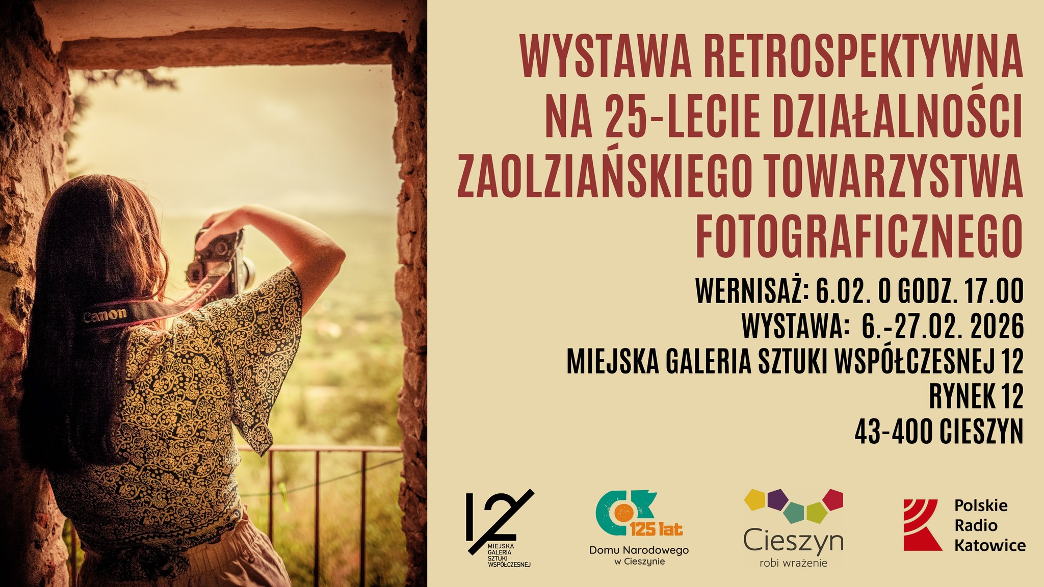 Cieszyński Ośrodek Kultury „Dom Narodowy” zaprasza na wernisaż wystawy retrospektywnej, przygotowanej specjalnie na tę okazję. Wydarzenie odbędzie się w piątek, 6 lutego 2026 roku o godzinie 17:00 w Miejskiej Galerii Sztuki Współczesnej 12, mieszczącej się na parterze Domu Narodowego (Rynek 12 w Cieszynie).