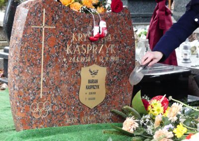 Uczestnicy pogrzebu przejechali spod katedry na cmentarz parafialny w Kamienicy. Tu Marian Kasprzyk spoczął obok ukochanej żony Krystyny, a modlitwę pożegnalną na cmentarzu poprowadził ks. biskup Piotr Greger.