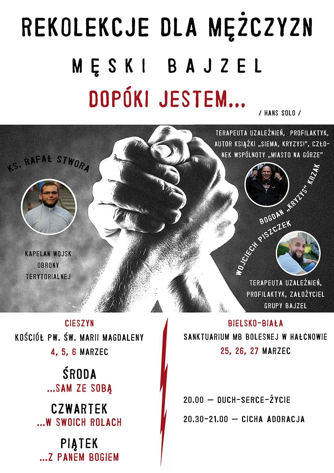 Od najbliższej środy do piątku odbędą się rekolekcje dla mężczyzn. Ich hasło brzmi: „DOPÓKI JESTEM…” i zostało zainspirowane postacią św. Józefa – człowieka milczenia, wierności i odpowiedzialności. Spotkania będą miały miejsce w kościele każdego dnia w godzinach od 20:00 do 21:00. To propozycja dla tych, którzy chcą na chwilę zatrzymać się w biegu codzienności i spojrzeć na swoje życie w świetle Ewangelii. Szczegółowy program oraz dodatkowe informacje można znaleźć na plakacie, stronie internetowej oraz w mediach społecznościowych parafii.