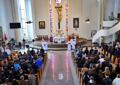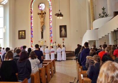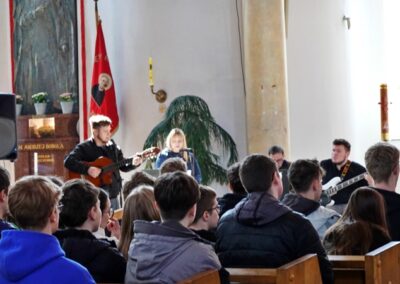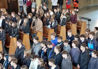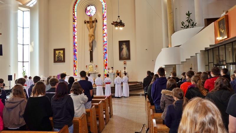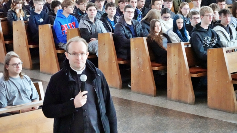 Homilię do zebranej młodzieży wygłosił ks. Dawid Surmiak, który nawiązał do codziennych doświadczeń młodych ludzi, ukazał, że to, co trudne i wymagające, często przynosi najgłębszą radość i rozwój. Przywołał przykład wymagających nauczycieli, którzy – choć budzili respekt – pomagali odkrywać pasję i uczyli systematyczności. Przypomniał słowa św. Jana Pawła II: „Wymagajcie od siebie, choćby inni od was nie wymagali”. Ks. Dawid podkreślił, że podobna logika dotyczy życia duchowego. – Prawdziwa radość nie rodzi się z łatwych wyborów, ale z wierności wartościom, nawet jeśli wymagają wysiłku. Zwrócił uwagę, że Kościół wskazuje, co jest dobre, a co prowadzi do zagubienia, nie z własnej inicjatywy, lecz odczytując zamysł Boga wobec człowieka. Ks. Dawid wskazał trzy postawy, które kształtują dojrzałą wiarę. Pierwszą z nich jest odwaga – gotowość do podejmowania decyzji wbrew presji otoczenia, do „pójścia pod prąd” i wierności zasadom. Drugą jest autentyczność, czyli spójność między deklaracjami a codziennym życiem. – Łatwo powiedzieć: jestem wierzący, trudniej żyć według tej deklaracji. Trzecią postawą jest odpowiedzialność, rozumiana jako gotowość do podejmowania trudów codzienności, troski o innych i wierności podjętym zobowiązaniom.