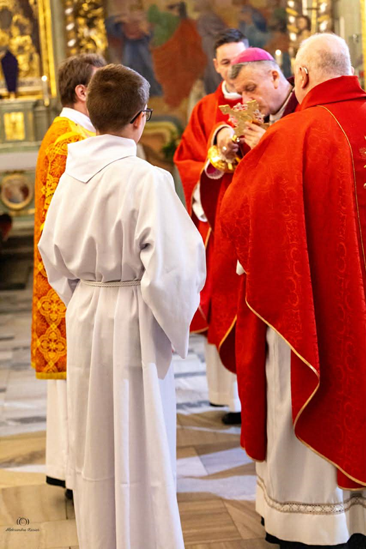 „Instalujemy dziś w tej parafii relikwie Krzyża, czyli wprowadzamy w sposób uroczysty do kultu relikwiarz zawierający cząstkę tego Krzyża, na którym umarł Chrystus za grzechy całego świata. Odtąd będziemy mogli całować ten relikwiarz, by w taki sposób oddawać cześć samemu Jezusowi i dziękować Jemu samemu za miłość do ludzi. Dzisiejszy wieczór jest jak najbardziej odpowiedni, by tak zacząć oddawać cześć Jezusowi. Rozpoczyna się Wielki Tydzień i czyta się tekst Ewangelii o męce i śmierci Jezusa. Od tej niedzieli będziemy wspominać wydarzenia tygodnia, w którym doszło do spisku na życie Jezusa, a Judasz umówił się z Jego przeciwnikami o cenę i sposób zdrady Mistrza. W czwartek zaczyna się męka Jezusa, pojmanie i przesłuchania, skazanie na śmierć i droga z Krzyżem na Golgotę, straszliwa agonia i pogrzebanie ciała. Wszystko to powinniśmy mieć w pamięci, gdy pragniemy ucałować cząstkę tego Krzyża, na którym – jak śpiewamy – „zawisło Zbawienie świata”. Nim Jezus ujrzał ten Krzyż i wziął go na swoje ramiona,wspomniał go, gdy zapowiadał swoją mękę, śmierć i zmartwychwstanie. Kiedy Piotr chciał Go powstrzymać od tego, usłyszał straszne słowa od Jezusa: „Zejdź mi z oczu, szatanie, bo nie myślisz o tym, co Boże, ale o tym co ludzkie” (Mk 8, 33).
