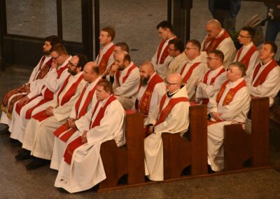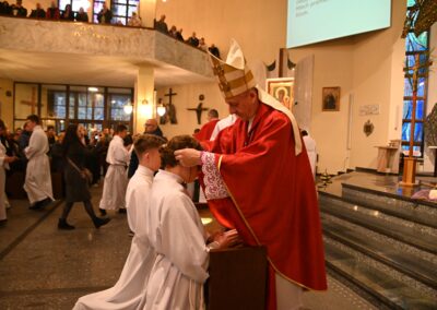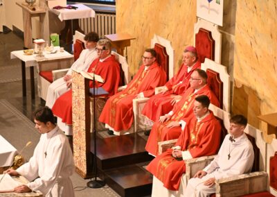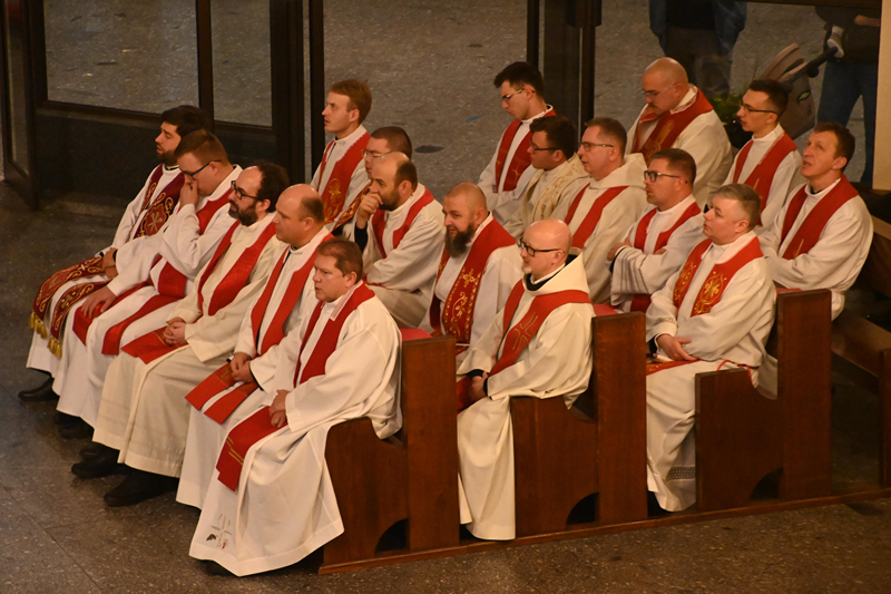 Uroczystą koncelebrowaną Eucharystię sprawował ks. biskup Roman Pindel z ks. Piotrem Górą – sekretarzem ks. biskupa Romana, ks. Przemysławem Gawlasem i ks. Jakubem Kuklińskim- duszpasterzami służby liturgicznej, Piotrem Kanią- wikariuszem z kościoła św. Barbary w Strumieniu. W liturgii. udział wzięli liczni księżą z naszej diecezji, którzy na co dzień w swoich parafiach opiekują się ministrantami.