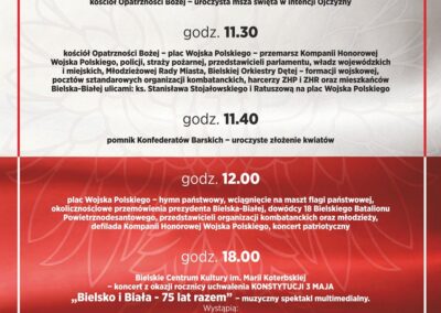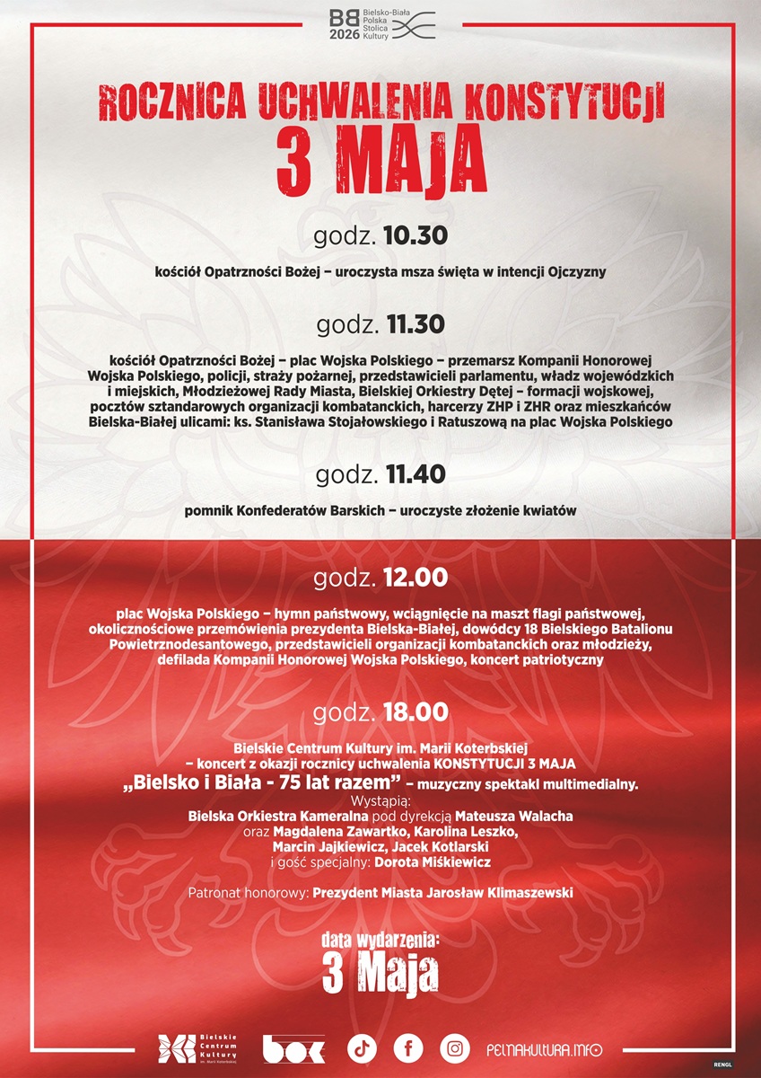 Oficjalne uroczystości związane z 235. rocznicą uchwalenia Konstytucji 3 maja rozpoczną się 3 maja br. o godz. 10.30 odprawieniem Mszy Św. w intencji ojczyzny w Kościele Opatrzności Bożej w Białej. Stamtąd o godz. 11.30 ulicami ks. Stanisława Stojałowskiego i Ratuszową na Plac Wojska Polskiego przejdzie Kompania Honorowa Wojska Polskiego oraz przedstawiciele – policji, straży pożarnej, parlamentu, władz wojewódzkich i miejskich, Młodzieżowej Rady Miasta wraz z Bielską Orkiestrą Dętą – formacją wojskową i pocztami sztandarowymi organizacji kombatanckich, harcerzy ZHP i ZHR oraz osobami zgromadzonymi. O godz. 11.40 zostaną złożone kwiaty pod pomnikiem Konfederatów Barskich. Na Placu Wojska Polskiego zostanie wciągnięta flaga państwowa na maszt i w samo południe zabrzmi hymn państwowy. Zostaną wygłoszone okolicznościowe wystąpienia prezydenta miasta, dowódcy 18 Bielskiego Batalionu Powietrznodesantowego, przedstawicieli organizacji kombatanckich i młodzieży. Odbędą się też defilada Kompanii Honorowej Wojska Polskiego i koncert patriotyczny.